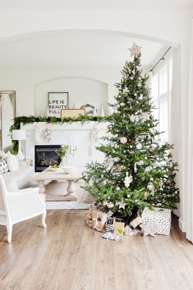 When it comes to Christmas decorating it usually tends to lean either towards minimalism or maximalism. The simplicity of greenery mixed with a few white or metallic elements can be refreshingly beautiful. This article provides some great inspiration such as the photos below.