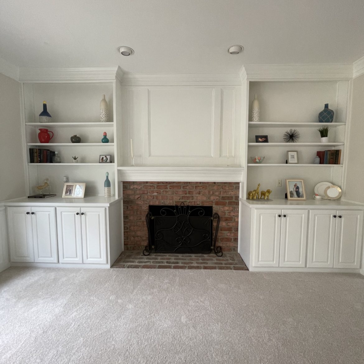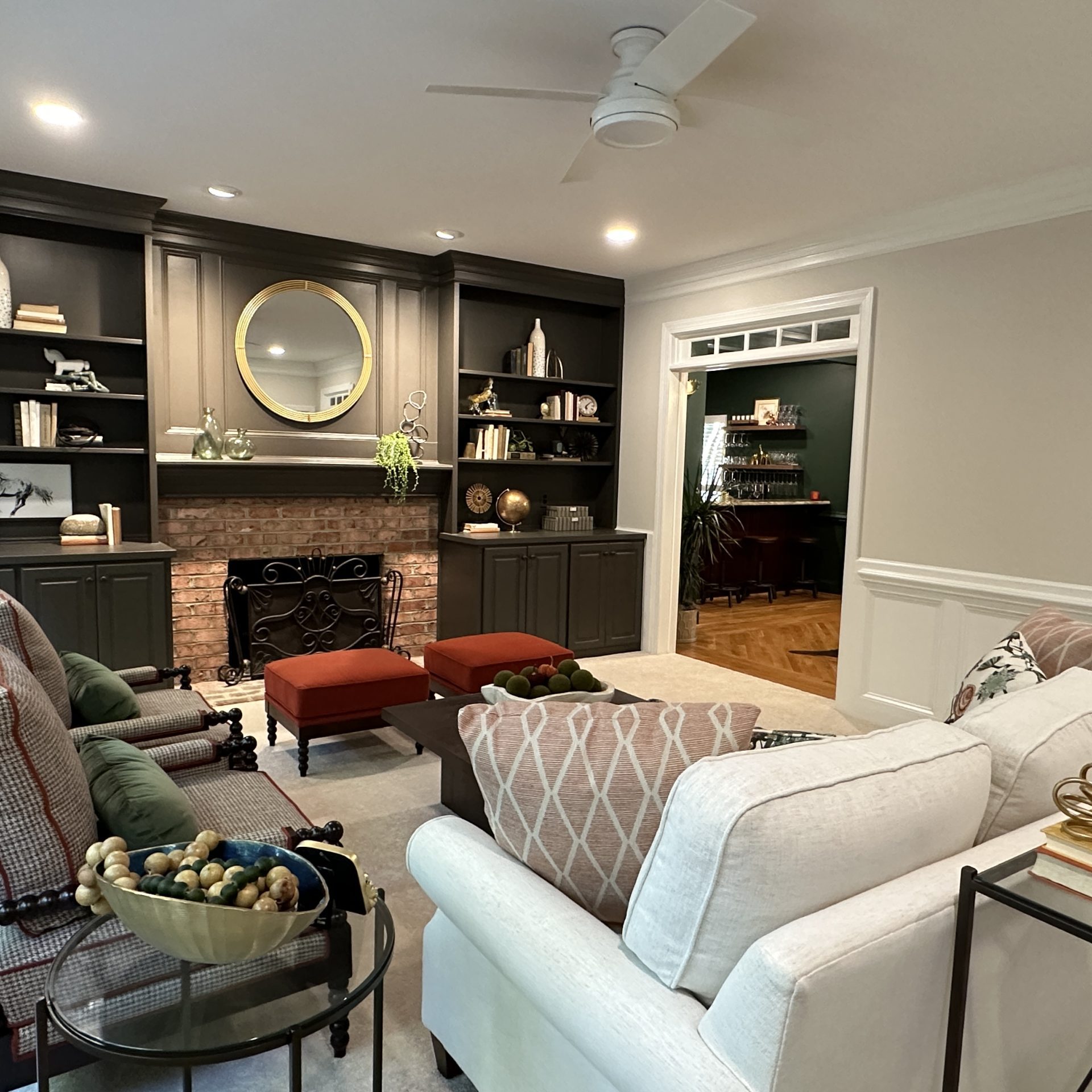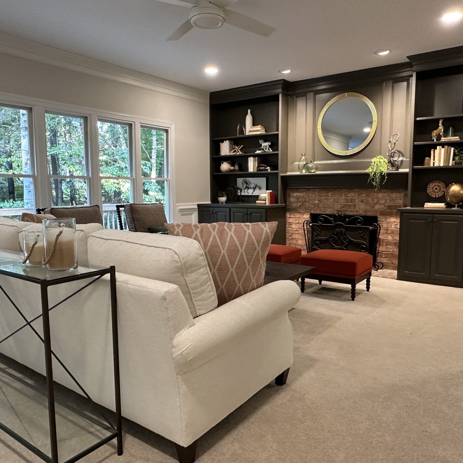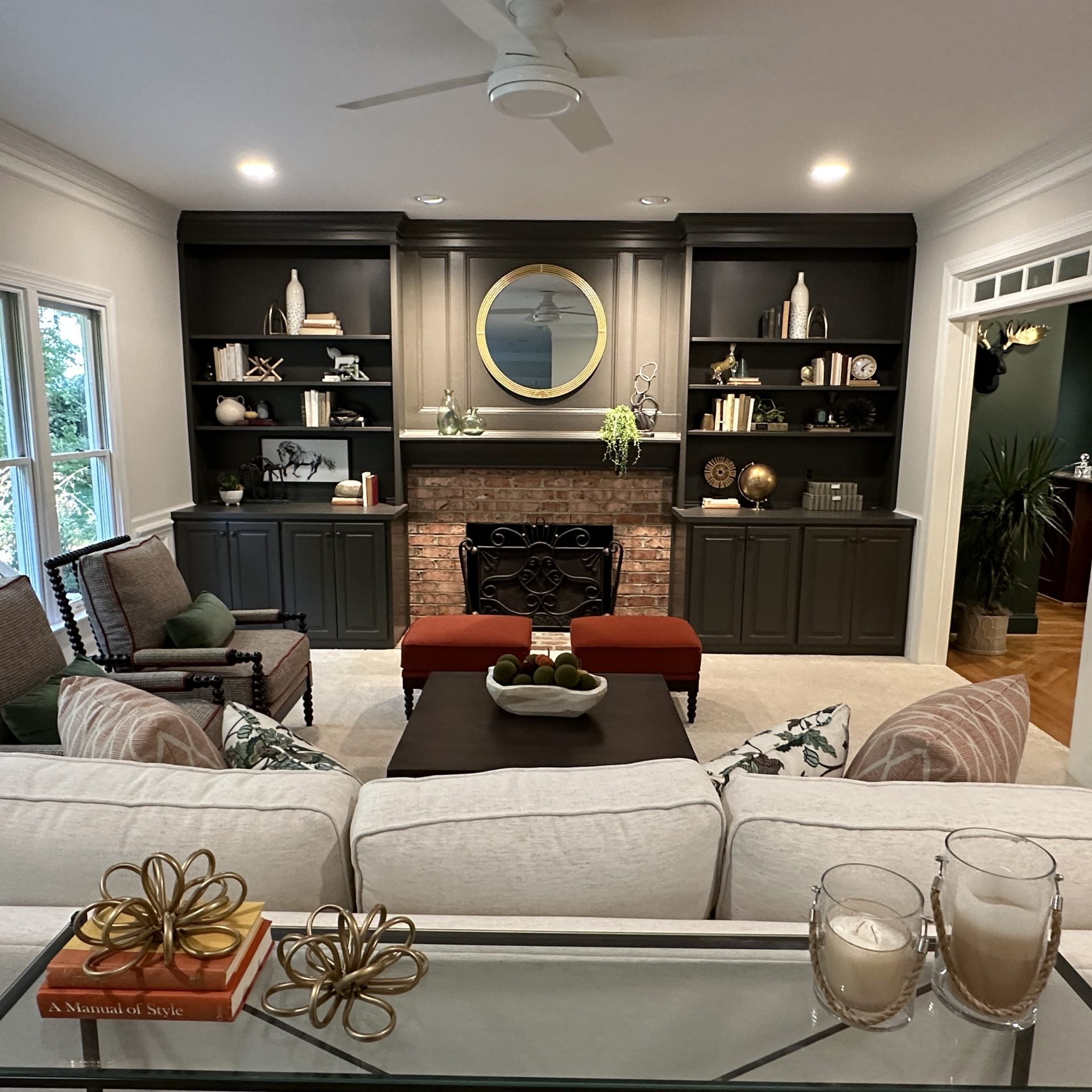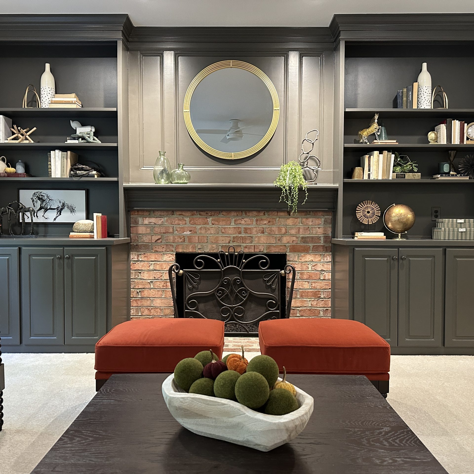 For the family room we wanted a sophisticated southern living aesthetic with equestrian touches. The room also needed to work well with the rest of the spaces in the home. First thing was finding a dramatic color to make the bookshelves stand out as the focal point of the room. We went with one of our favorites, Urbane Bronze by Sherwin Willams. Next was furniture, lighting, artwork and styling to bring the entire space together.