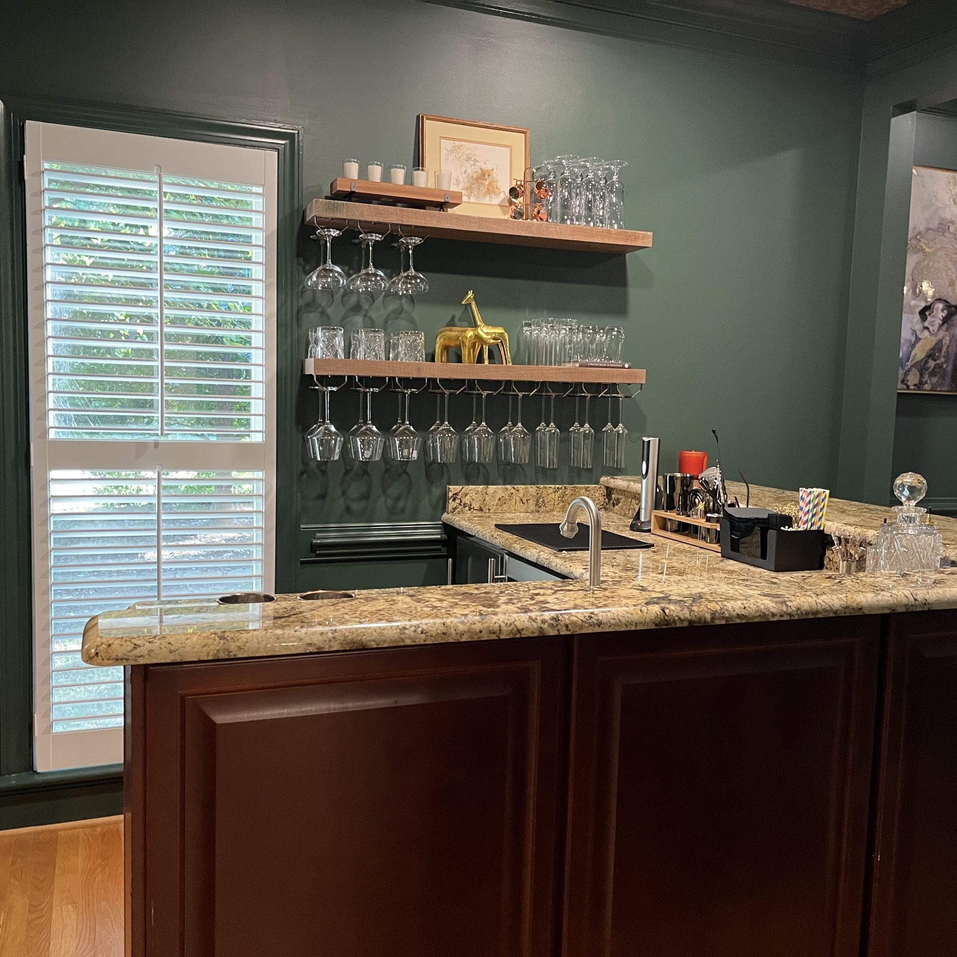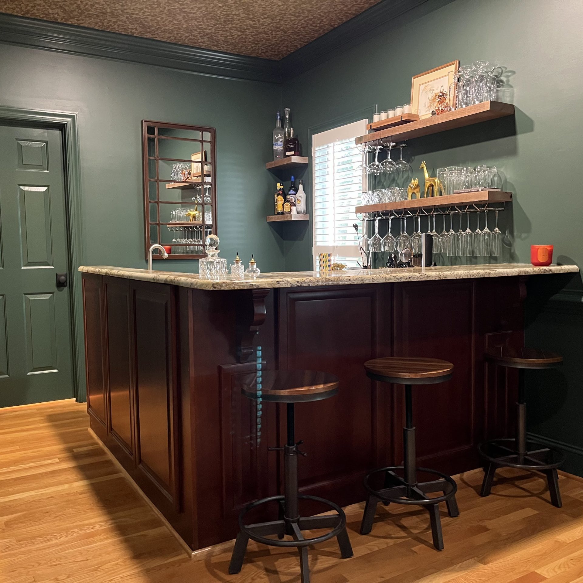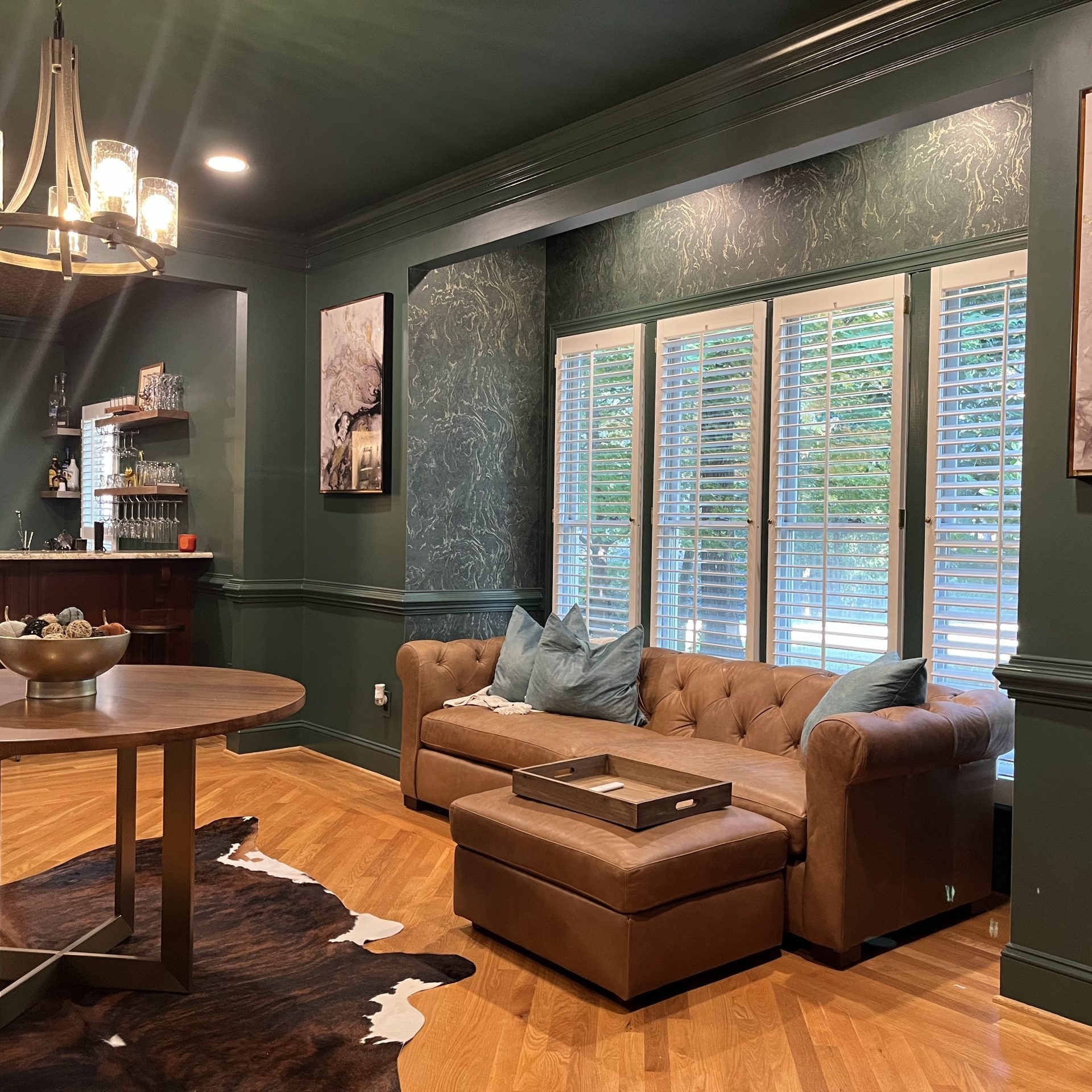 For the gentlemen’s lounge we wanted it to feel like you stepped right into a dark moody speakeasy. Somewhere to lounge, sip on your favorite cocktail and play a card game. We jewel-boxed the lounge; painting the entire room including celling and trim in Billards Green by Sherwin Williams. We added wall paper in the niche around the windows and on the bar ceiling to add visual interest and texture. For furniture, we knew we wanted a more masculine vibe so we went with a cognac leather sofa, maple wood and touches of brass. We knew we wouldn’t be changing the bar itself, so it all had to flow together. The clients needed more storage for glassware so we had custom shelving built and added to the blank wall above the bar. It all came together beautifully in the end.