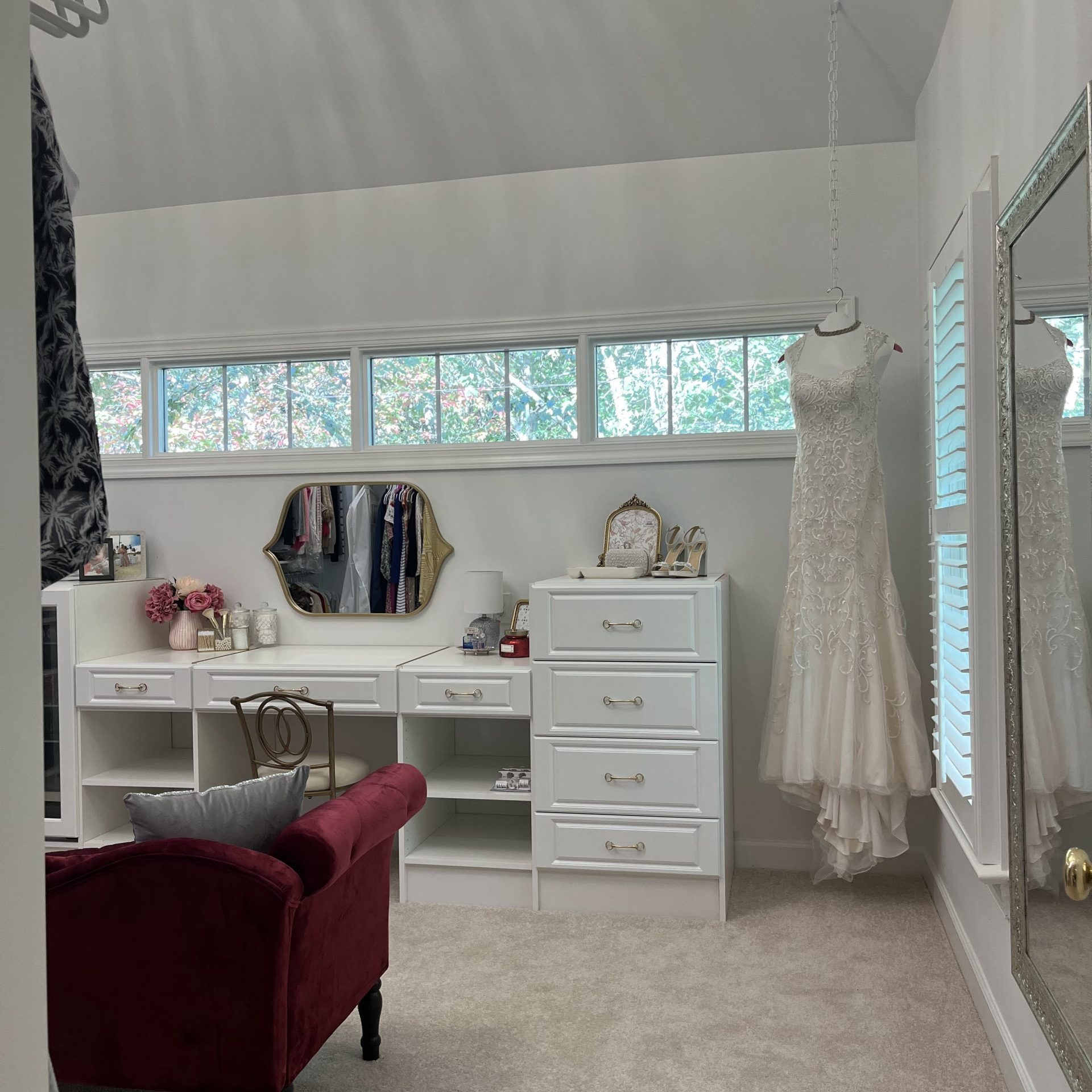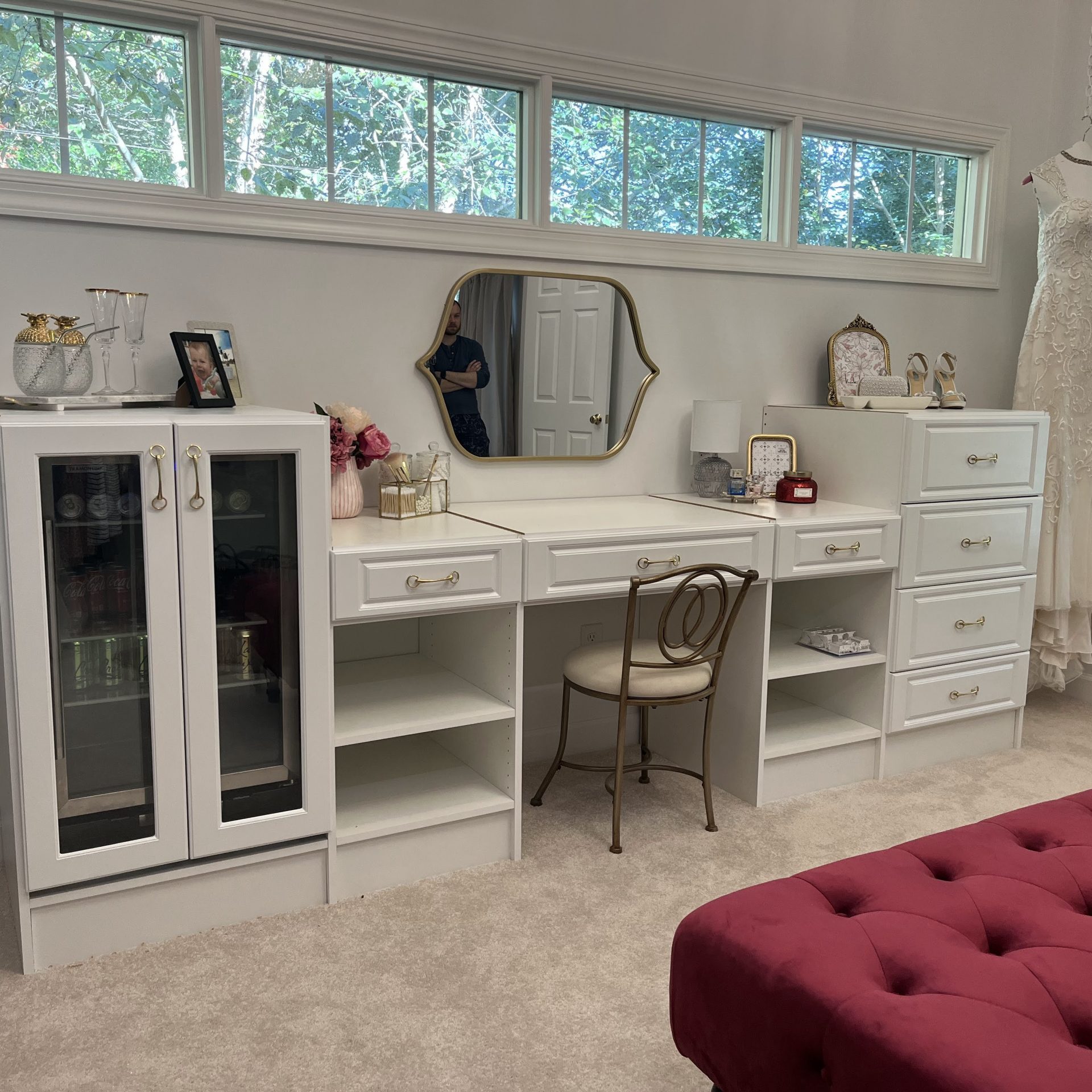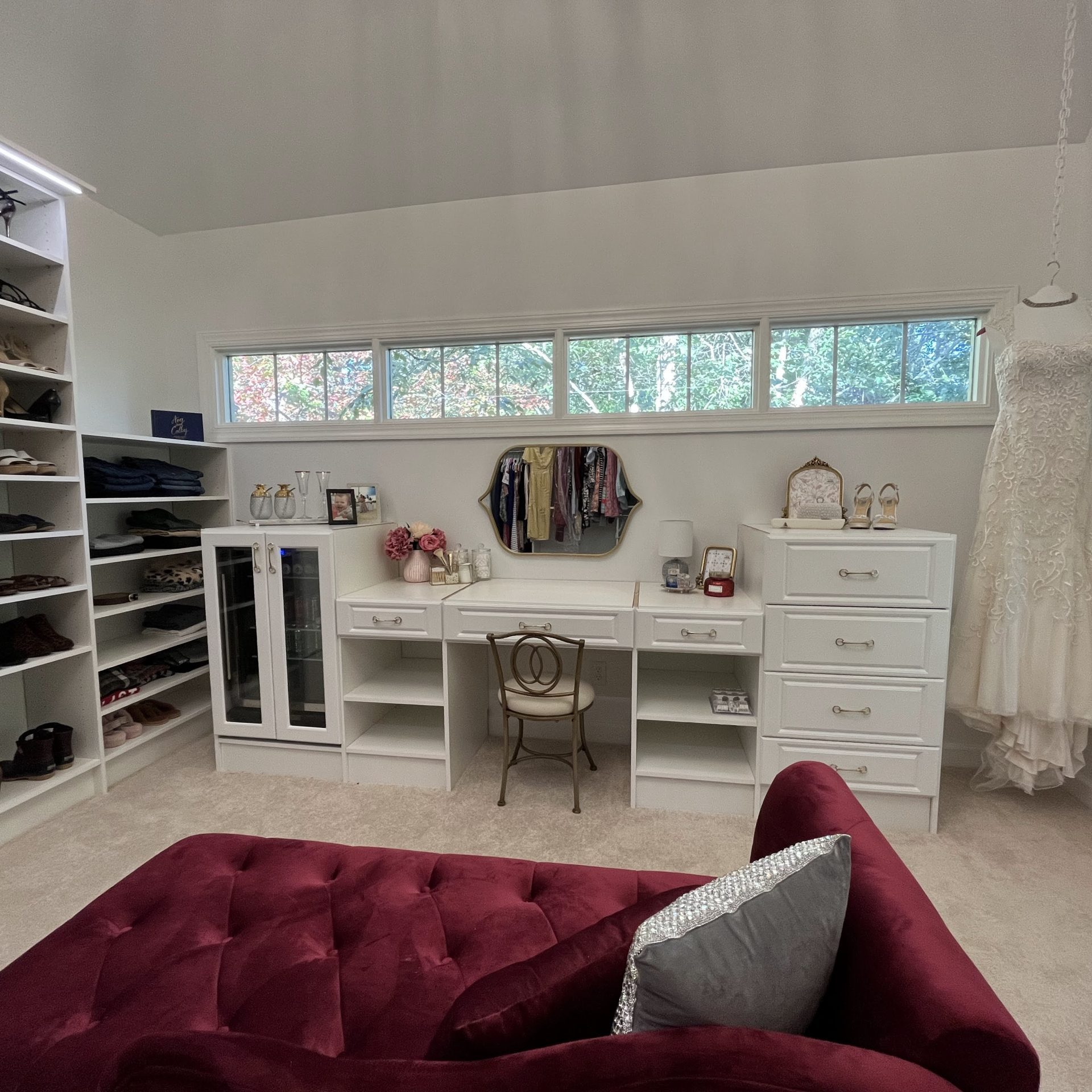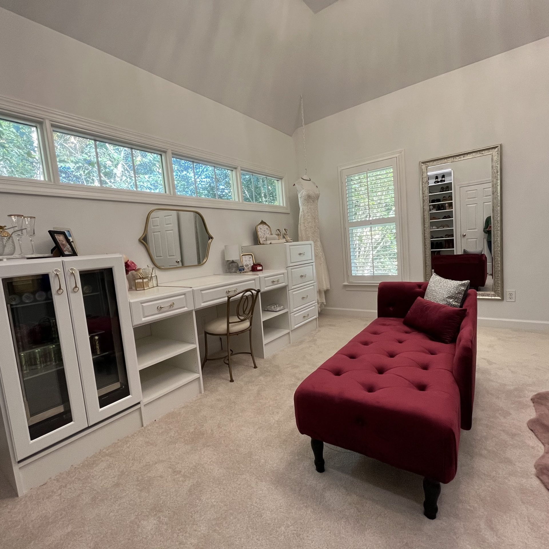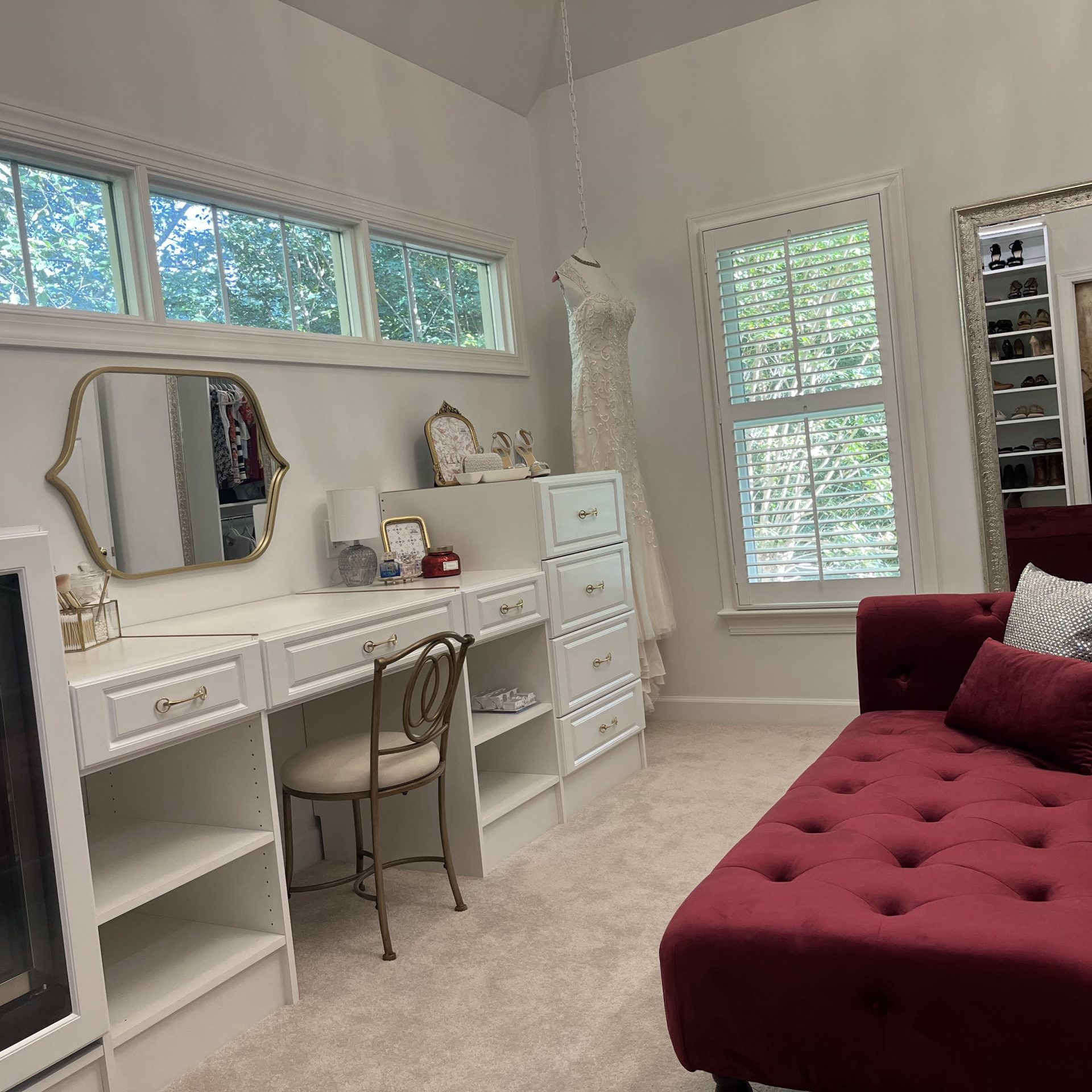 This room was right off the primary suite but wasn’t being properly utilized. We decided to turn this space into the ultimate girly dream walk-in closet. We had custom shelving and a vanity installed, then sourced some feminine seating, lighting, and accessories.