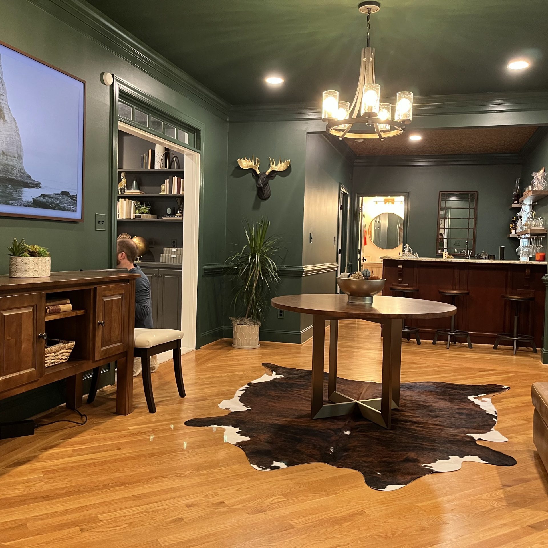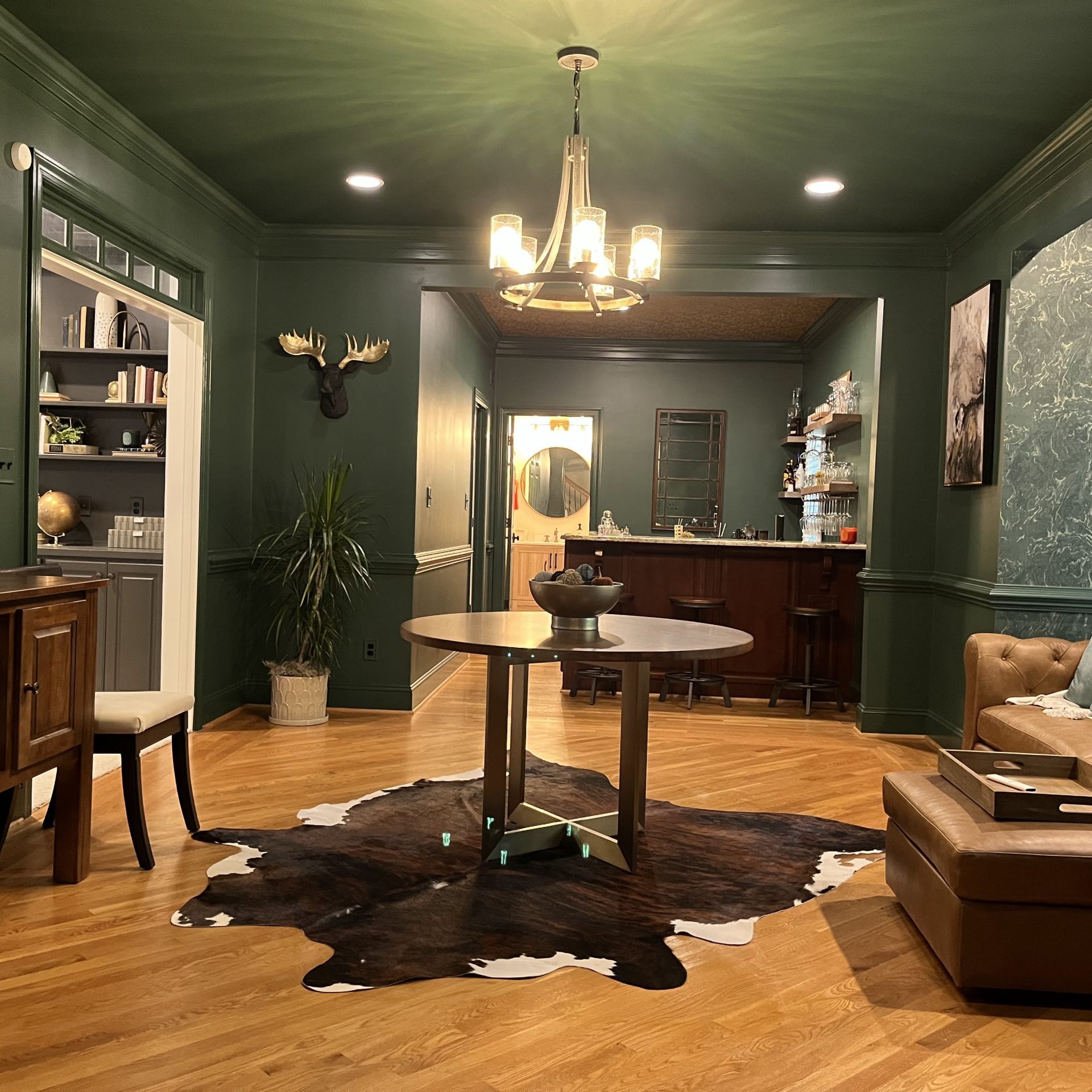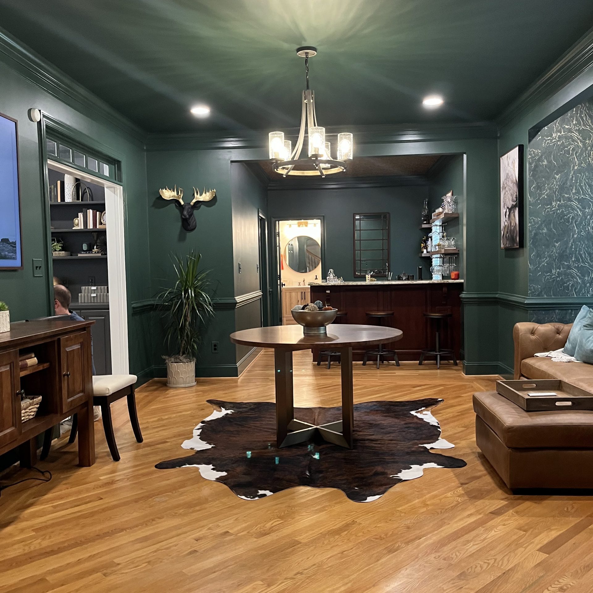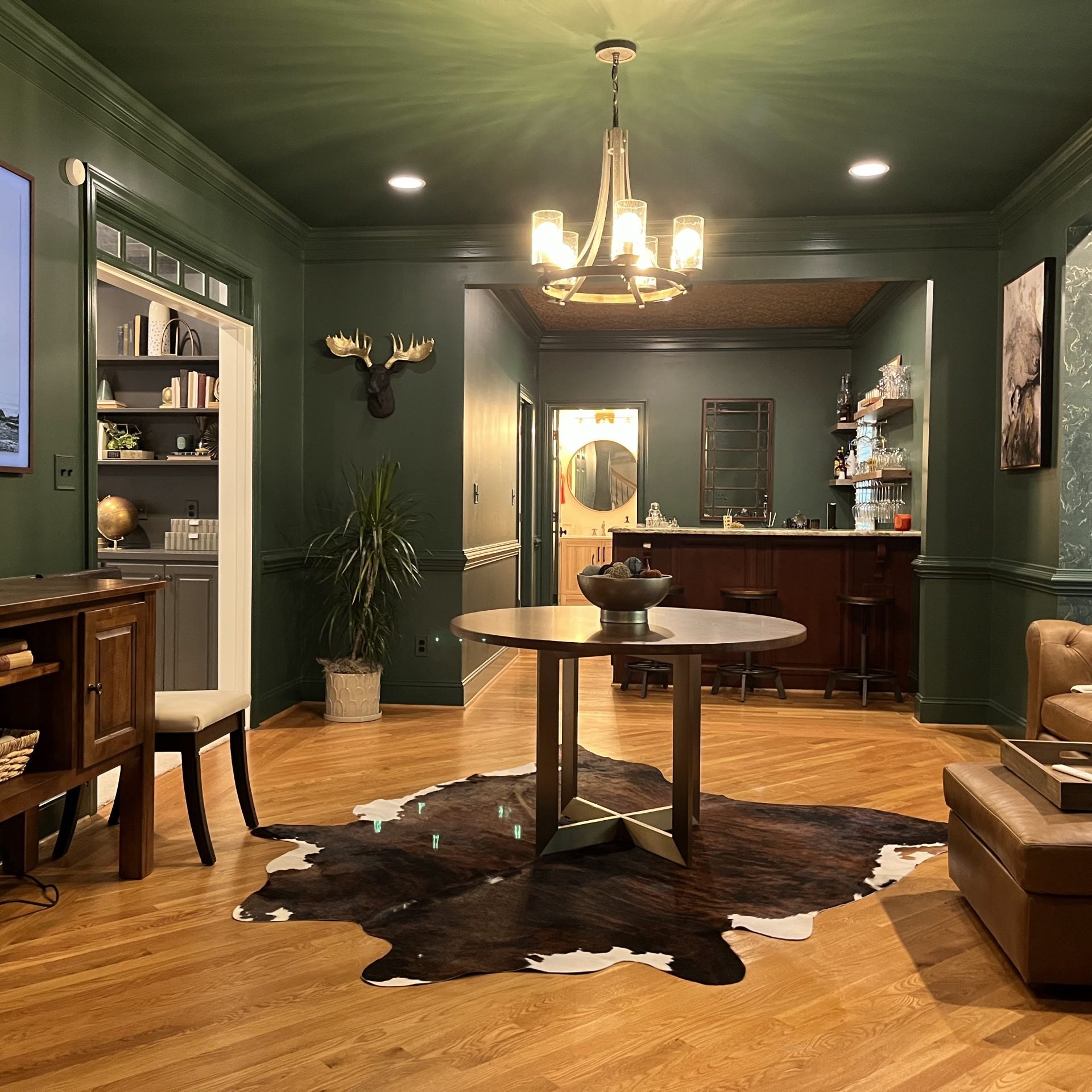 The next room we focused on was the Dining Room. It needed a punch of character to suit the homeowners style. The room also sits directly across from the lounge, so it needed to have an equally dramatic aesthetic while flowing with the lounge space. We took some inspiration from a photo we found online by a local Raleigh blogger Sunny Circle Studio and ran with it. We painted all the wainscoting and trim Favorite Jeans by Sherwin Williams. Then it was time to curate furniture, lighting, and a rug. We tied the dining room and lounge together by using the same maple wood tone from Bassett Furniture, and choosing a rug with green tones. We talked the clients into going a little more glam with their chandelier, and we’re so happy the did!
