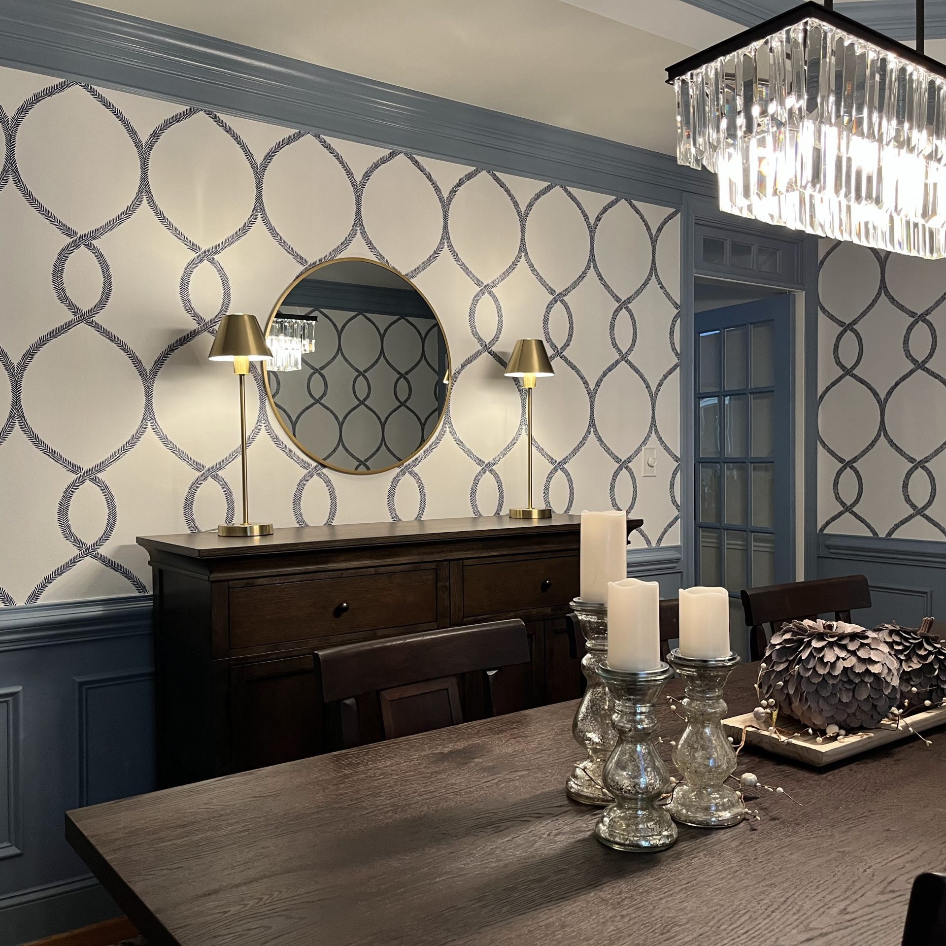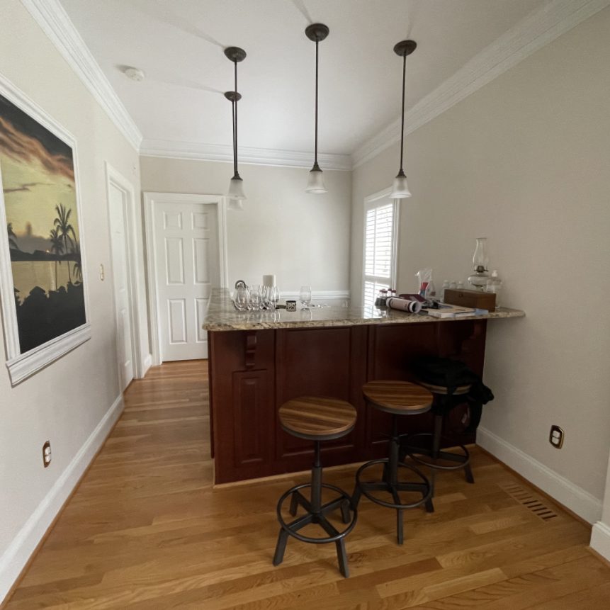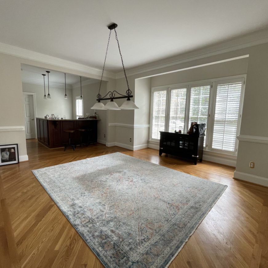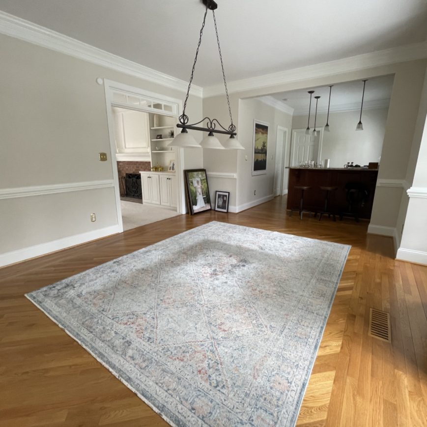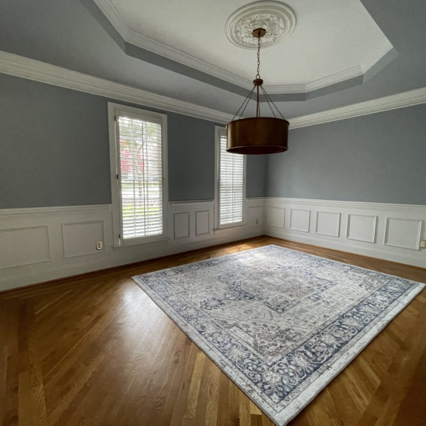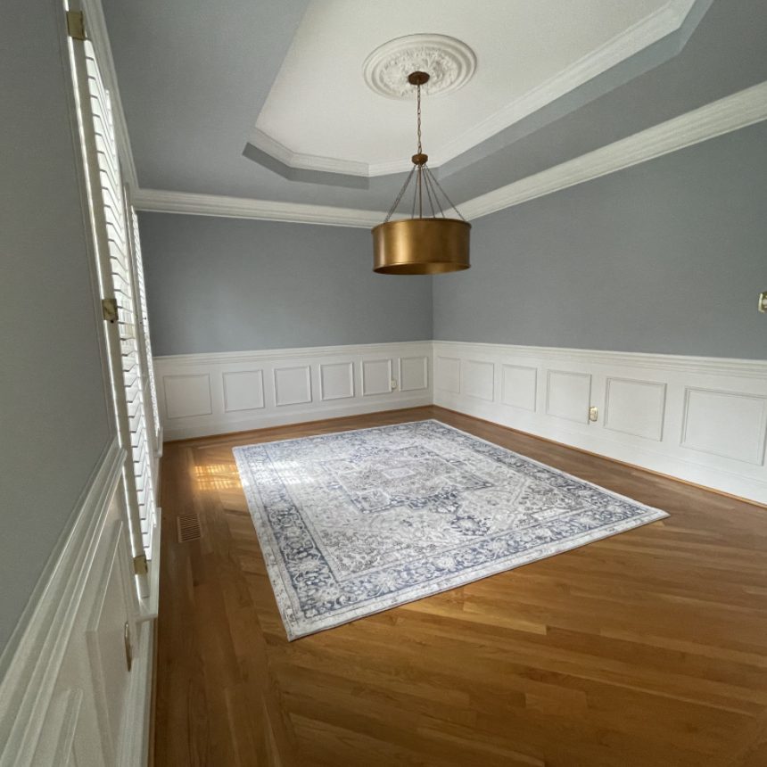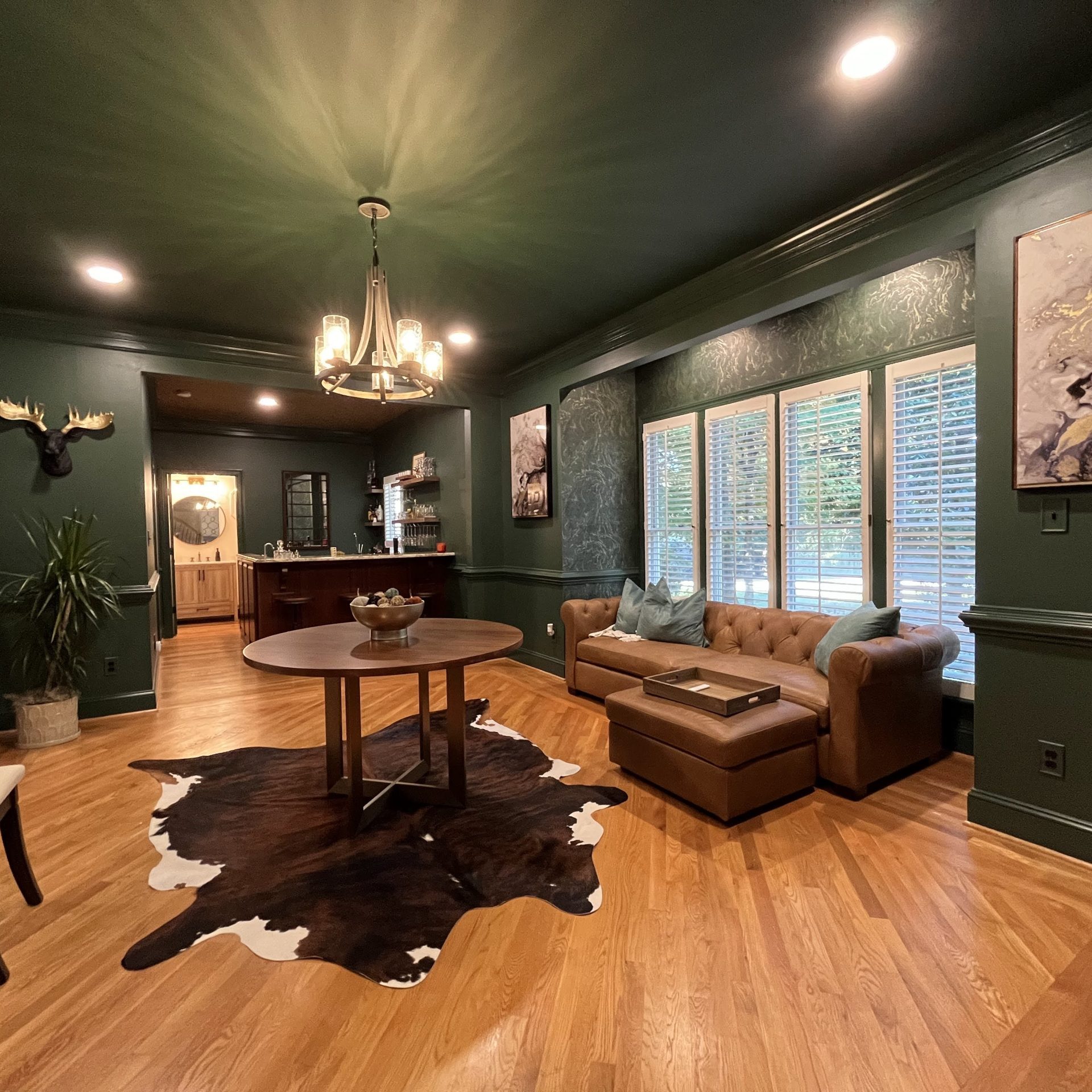 The next room we focused on was the Dining Room. It needed a punch of character to suit the homeowners style. The room also sits directly across from the lounge, so it needed to have an equally dramatic aesthetic while flowing with the lounge space. We took some inspiration from a photo we found online by a local Raleigh blogger Sunny Circle Studio and ran with it. We painted all the wainscoting and trim Favorite Jeans by Sherwin Williams. Then it was time to curate furniture, lighting, and a rug. We tied the dining room and lounge together by using the same maple wood tone from Bassett Furniture, and choosing a rug with green tones. We talked the clients into going a little more glam with their chandelier, and we’re so happy the did!