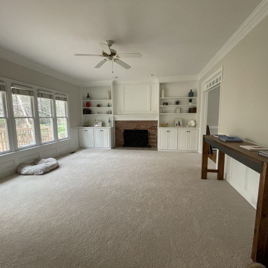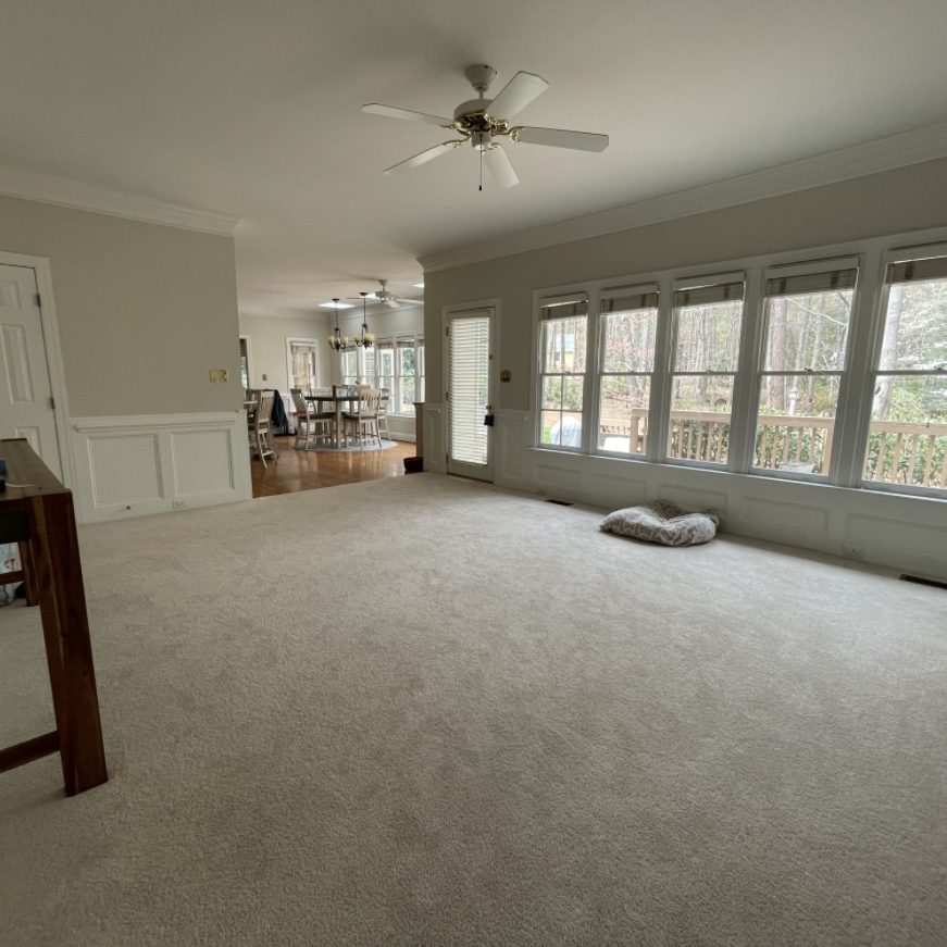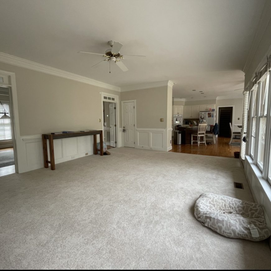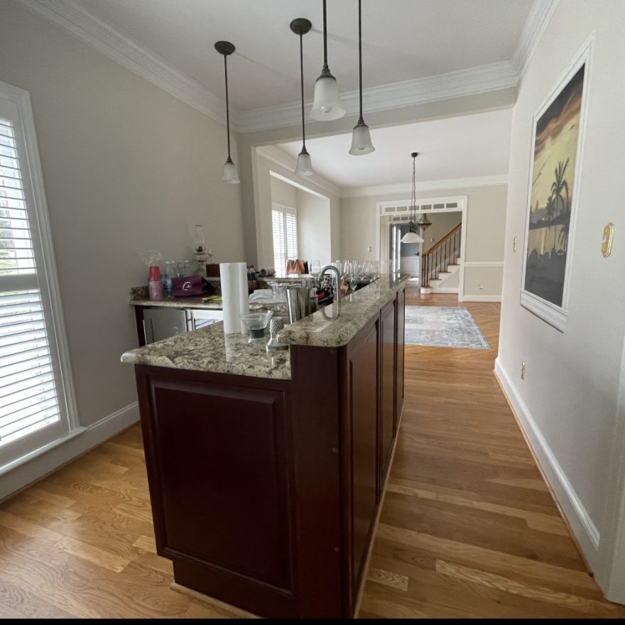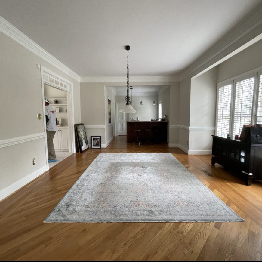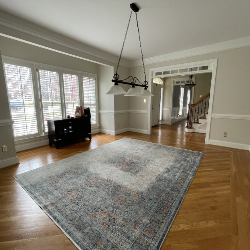 The next room we focused on was the Dining Room. It needed a punch of character to suit the homeowners style. The room also sits directly across from the lounge, so it needed to have an equally dramatic aesthetic while flowing with the lounge space. We took some inspiration from a photo we found online by a local Raleigh blogger Sunny Circle Studio and ran with it. We painted all the wainscoting and trim Favorite Jeans by Sherwin Williams. Then it was time to curate furniture, lighting, and a rug. We tied the dining room and lounge together by using the same maple wood tone from Bassett Furniture, and choosing a rug with green tones. We talked the clients into going a little more glam with their chandelier, and we’re so happy the did!